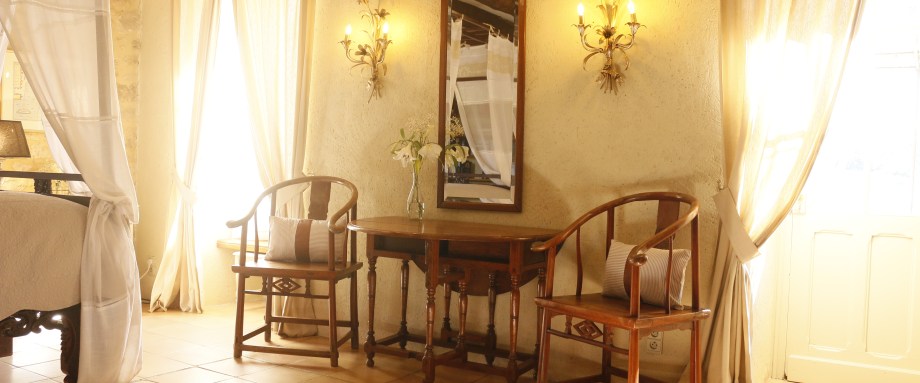 Chambre Truffe: east meets West. This classic, darker wood-designed room has direct access to the terrace/garden and living room. From the bed, there is a marvelous view of the garden, field, and forest. The high grand four-poster bed (2 meters by 1.80) is decorated with stylish curtains and pillows. A comfortable couch, table with two ‘Chinese love seats’, a storytelling 19th-century Qing-dynasty panel-door wardrobe, and an elegant Frisian-Indonesian cupboard make this room a comfortable retreat. The connected bathroom has a shower, toilet, sink, and heated towel rack. This room is perfect if you decide to bring your dog. There is a door with straight access to the terrace and garden.